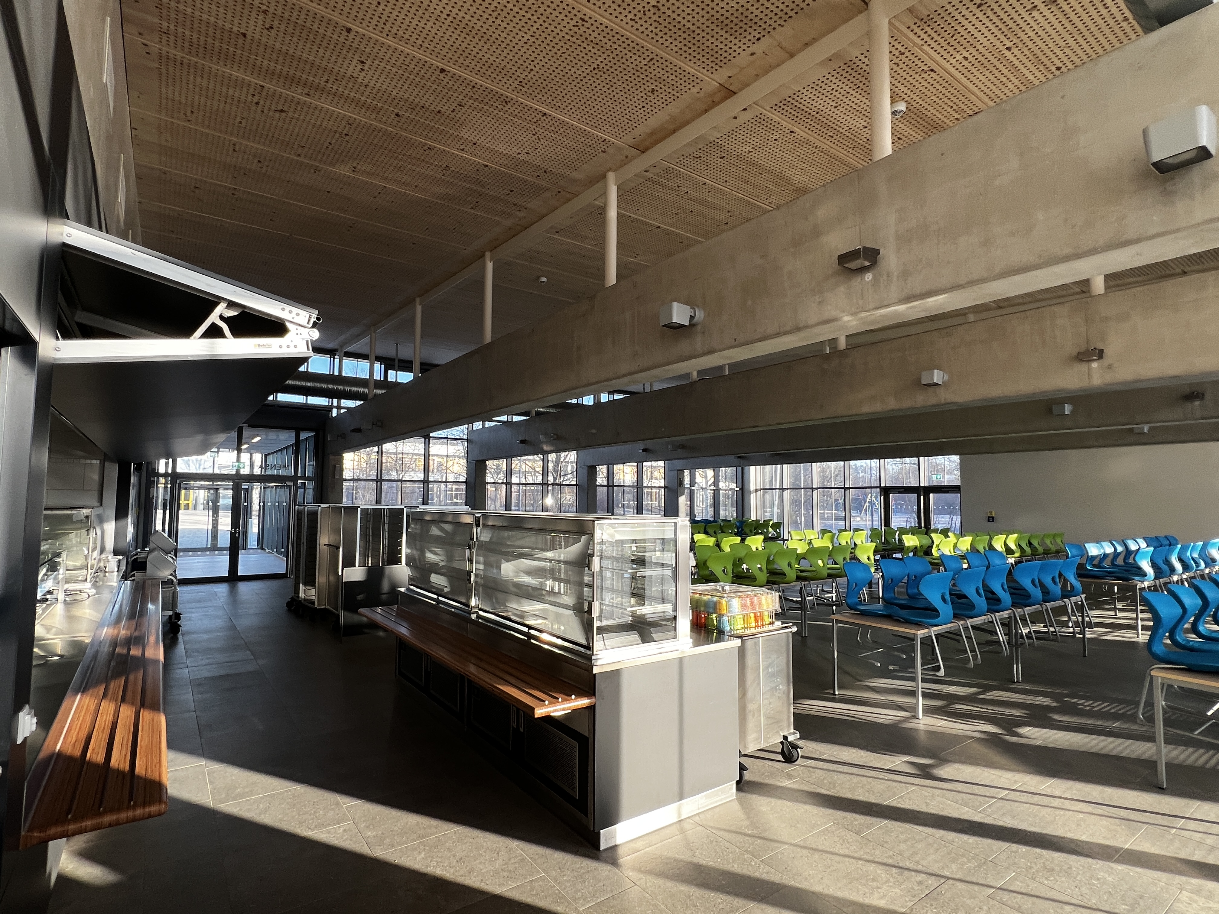 Der Neubau erfolgte im süd-westlichen Bereich des Schulgrundstücks der Anni-Pickert-Grund- und Mittelschule Poing. Die neue Mensa soll Essen für insgesamt 360 Schüler in bis zu 4 Schichten bereitstellen.