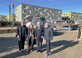 Foto v.r.: Christian Müller (Geschäftsführer der Münchner Wohnen), Erster Bürgermeister Thomas Stark mit den Architekten Annette Paul und Gert Lober