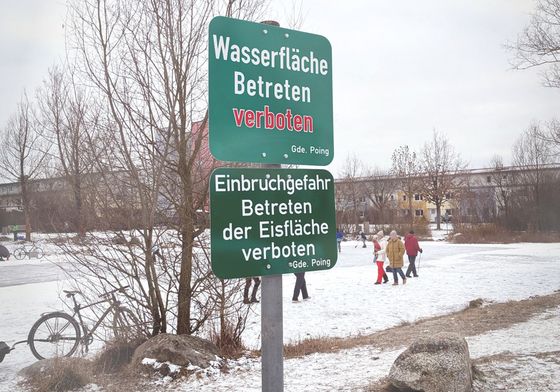 Auch wenn die Verlockung des Betretens groß ist: Die Eisflächen stellen eine erhebliche Gefahrenquelle dar. Auch wenn das Eis auf den ersten Blick stabil erscheint, ist die Tragfähigkeit nicht verlässlich einschätzbar. Unterschiedliche Wassertiefen, Strömungen, Zuflüsse oder Pflanzenbewuchs führen dazu, dass das Eis ungleichmäßig gefriert und an vielen Stellen deutlich dünner ist, als vermutet.
