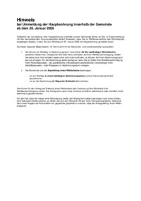 Hinweis bei Ummeldung der Hauptwohnung innerhalb der Gemeinde ab dem 26. Januar 2026 Anlässlich der Ummeldung Ihrer Hauptwohnung innerhalb unserer Gemeinde dürfen wir Sie im Zusammenhang mit den bevor