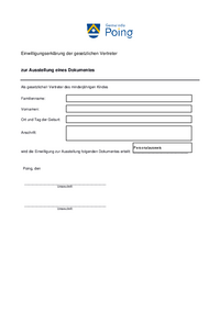 Einwilligungserklärung der gesetzlichen Vertreter zur Ausstellung eines Dokumentes Als gesetzliche/r Vertreter des minderjährigen Kindes Familienname: Vornamen: Ort und Tag der Geburt: Anschrift: