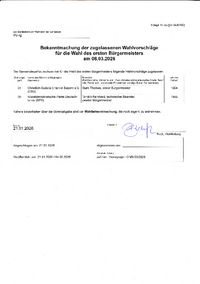 Bekanntmachung der zugelassenen Wahlvorschläge für die Wahl des ersten Bürgermeisters am 08.03.2026