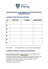 Bewerbungsbogen für die gebundenen Wohneinheiten W7 im Neubaugebiet Poing 1. Angaben zu allen Personen im Haushalt Nr. Nachname Vorname Geburtsdatum 1. 2. 3. 4. 5. 6. 7. ☐ Alleinerziehend ☐ Nich